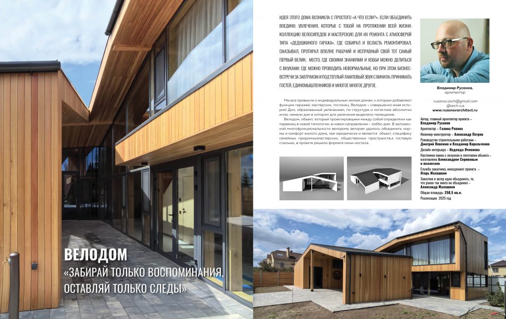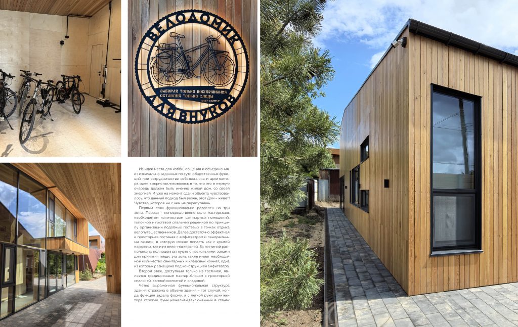 Велодом, объект, который проектировщики между собой определяли как первенец в новой типологии, в новом направлении - хобби-дом. В заложенной многофункциональности велодома авторам удалось объединить нормы и комфорт жилого дома, чем юридически и является объект, специфику семейных придомных мастерских, общественных пространств, а гостевую спальню, в проекте решили формате мини-хостела.