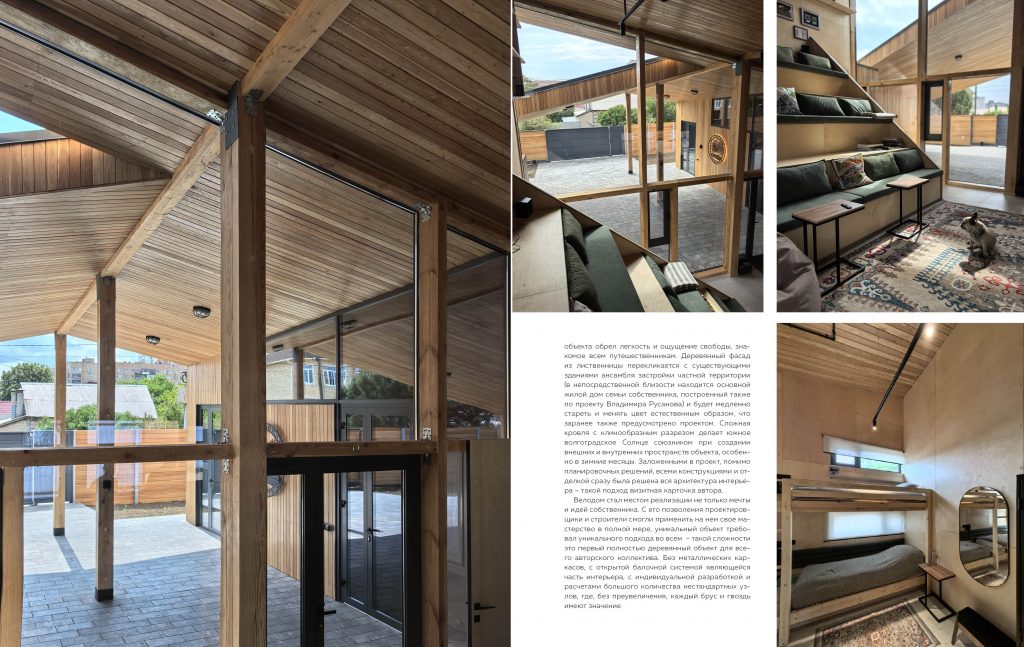 Четко выраженная функциональная структура здания отражена в объеме здания - тот случай, когда функция задала форму, а с легкой руки архитектора строгий функционализм, заключенный в стенах объекта обрел легкость и ощущение свободы, знакомое всем путешественникам. Деревянный фасад из лиственницы перекликается с существующими зданиями ансамбля застройки частной территории (в непосредственной близости находится основной жилой дом семьи собственника, построенный также по проекту Владимира Русанова) и будет медленно стареть и менять цвет естественным образом, что заранее также предусмотрено проектом. Сложная кровля с клинообразным разрезом делает южное волгоградское Солнце союзником при создании внешних и внутренних пространств объекта, особенно в зимние месяцы. Заложенными в проект, помимо планировочных решений, всеми конструкциями и отделкой сразу была решена вся архитектура интерьера – такой подход визитная карточка автора.